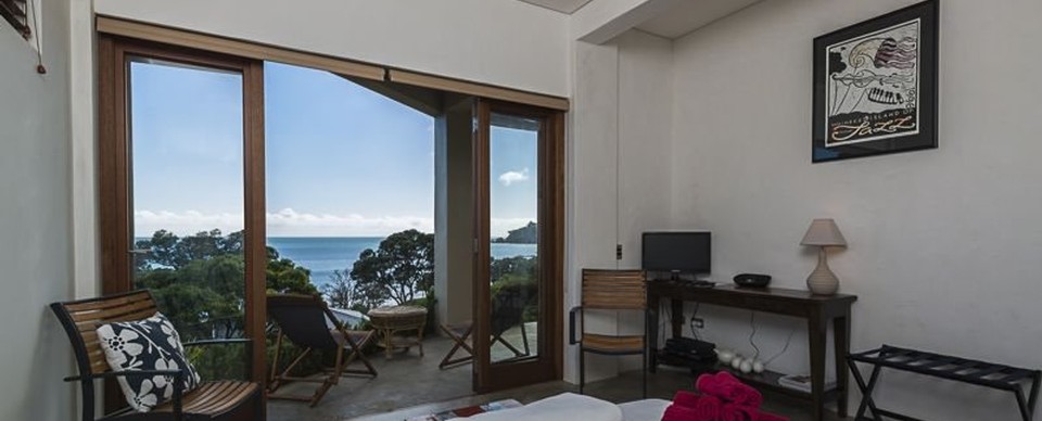 Peaceful, private and on the ground floor of a contemporary masonry house, this hotel-style suite is located in the heart of Oneroa Village, putting all of its restaurants, entertainment and services right at your doorstep. Accessed by key-controlled gate and framed by superb sea views, this beachfront Waiheke accommodation pampers guests with luxurious details, making it ideal for a romantic getaway or executive business trip. French doors open onto terraces with outdoor dining spaces and panoramas of Oneroa Beach. Concrete floors and hot water are solar-heated, and white Oreti sand-plastered walls and featured timbers are recycled or sustainably sourced. All products provided for guest use (and used in cleaning) are eco-friendly; all linen is laundered in soft rain water and sun-dried over lavender bushes; and the surrounding garden, a fusion of Mediterranean and Pacific, is all organic. An open-plan bedroom includes a media corner with free Wi-Fi and SKY TV. Tea- and coffee-making facilities are provided, as are a bar fridge, microwave and full set of tableware. Enjoy delicious village takeaways in your enclosed, umbrella-shaded courtyard, accessible via your en suite bathroom. The access path to Oneroa Beach begins at the nearby bus stop. There is no private parking, but street parking with no time restrictions is available.