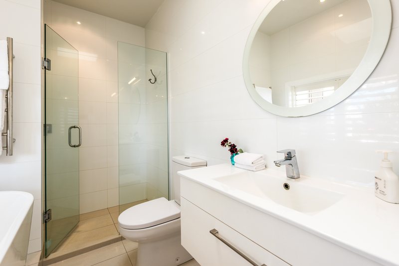 Luxury bathroom with freestanding bath with a sea view of the Hauraki Gulf, walk in shower and underfloor heating.