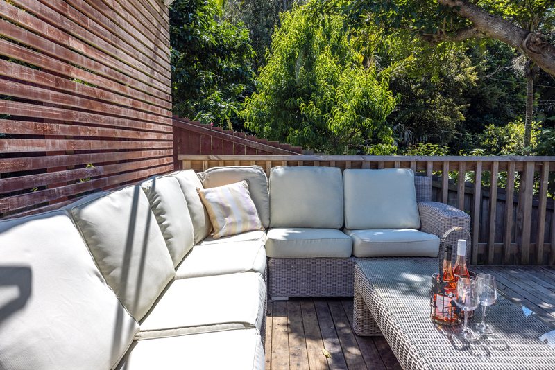 Deck with garden and bush view, seating for 5, BBQ, shade cloth, street parking for 2 cars on the berm, pet friendly with 1.6 metre high fence gate.