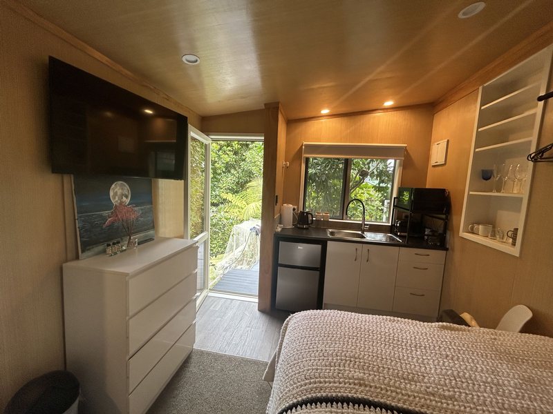 This private and peaceful couple's retreat offers all that is needed for escape and relaxation. Located in a luscious and sunny garden setting, Oasis Hideaway is perfectly placed for that much-needed getaway. It is on the 502 bus route from the Matiatia Ferry Terminal with the bus stop across the road for easy arrival. If you bring a vehicle, there is off-street parking available on the berm.