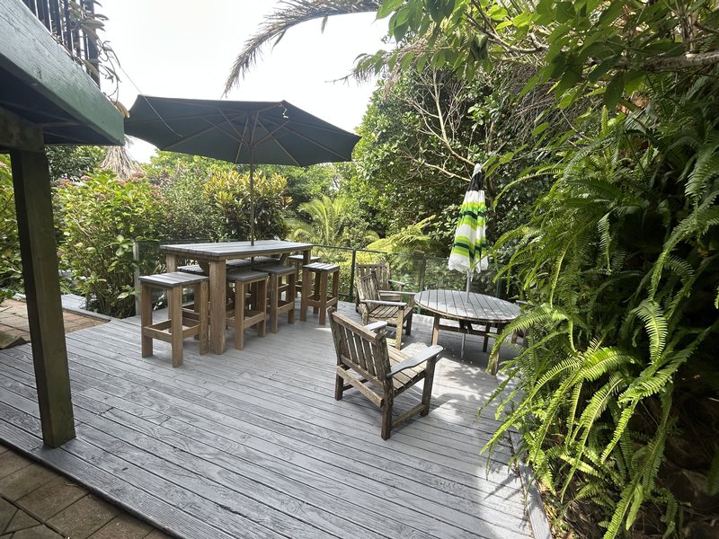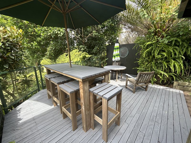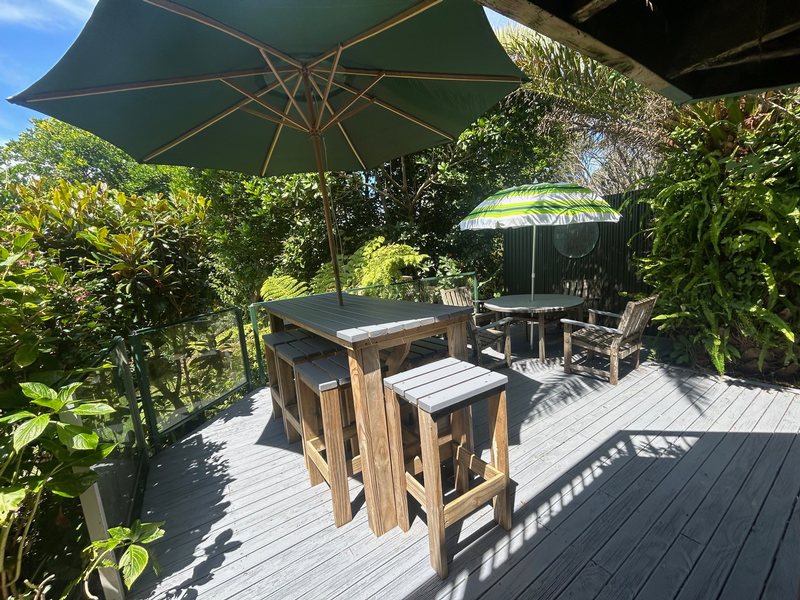 Sun drenched decks with secluded garden views, 2 large tables and chairs with umbrellas provided. BBQ, private walkway down from the roadside beside the main house, which is lit up at nighttime.
